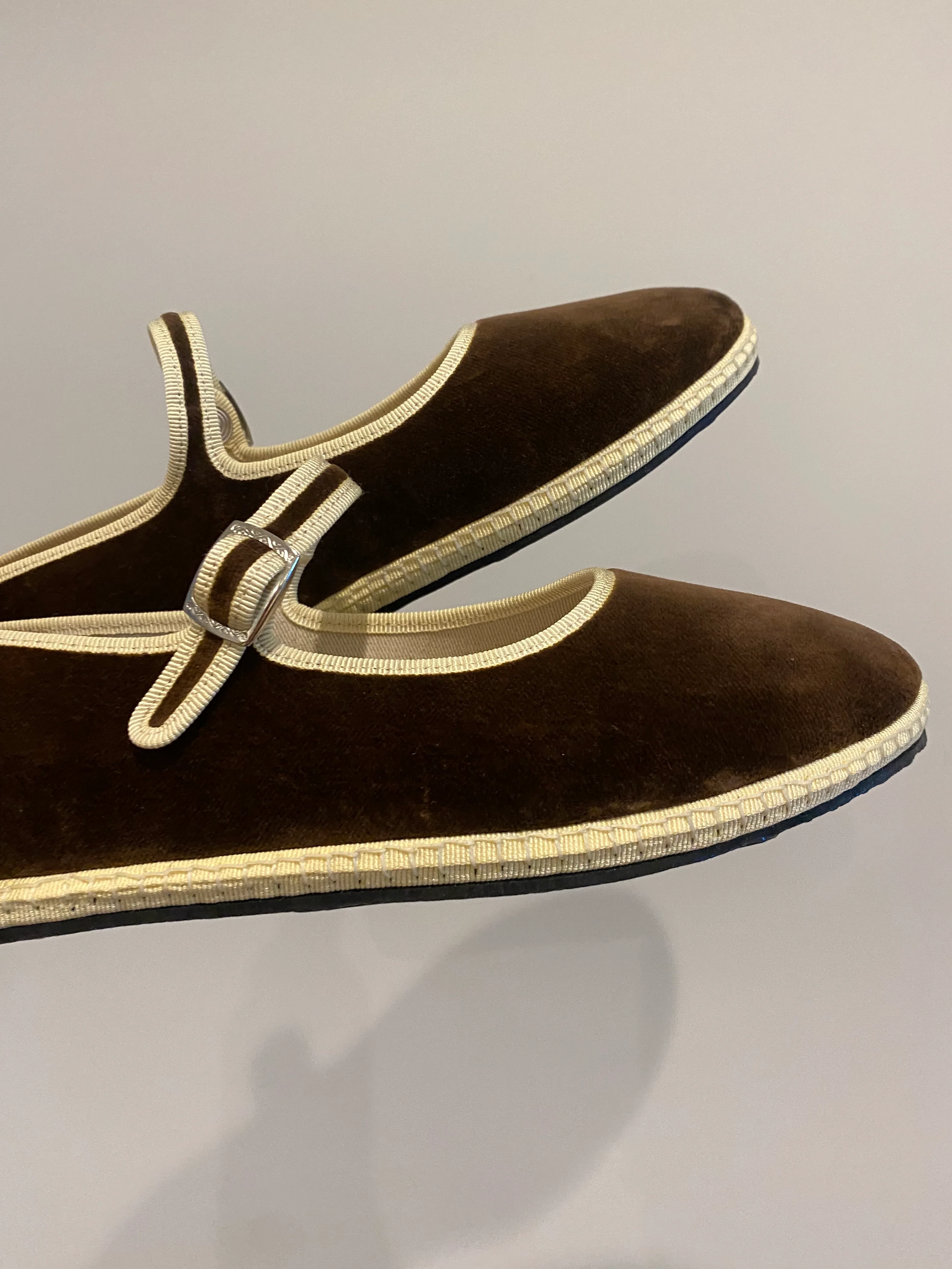 Our Camille Maryjane Friulane is in a timeless chocolate brown with a contrasting butter yellow trim.